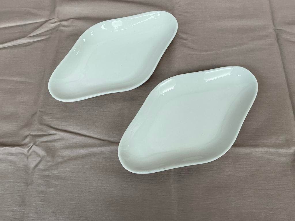 Set van twee prachtige, vintage schalen van petrus regout maastricht. Gemaakt van porselein in nederland. De schalen hebben een unieke, organische vorm en zijn perfect voor het serveren van bijgerecht
