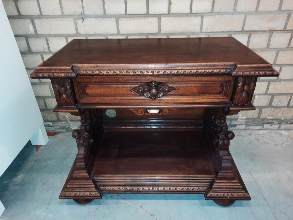 Antiek kastje met houtsnijwerk elementen. Maximum afmetingen : breedte ×diepte×hoogte = 88x47x67 cm bovenblad 80×40 cm open ruimte onder lade b×d×h = 60x35x32 cm