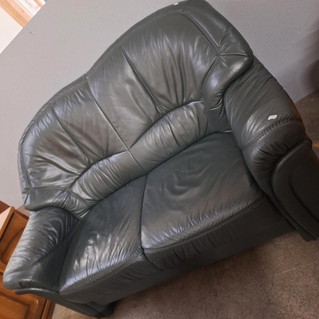 2 persoons bank, leer donkergroen in goede staat beschadigingen onderaan. Zie foto maten: zitdiepte 52 cm zithoogte 40 cm breedte 156 cm