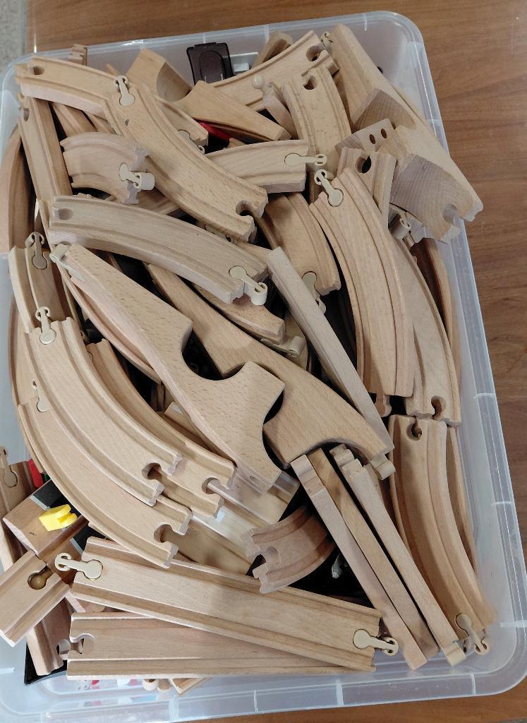 Grote doos vol treinen, rails, bruggen enz. 80 Bochten; 10 rechte, 10 “bruggen”, wissels, treintjes enz. Met de aankoop steunt u het werk van woord en daad. Alleen ophalen