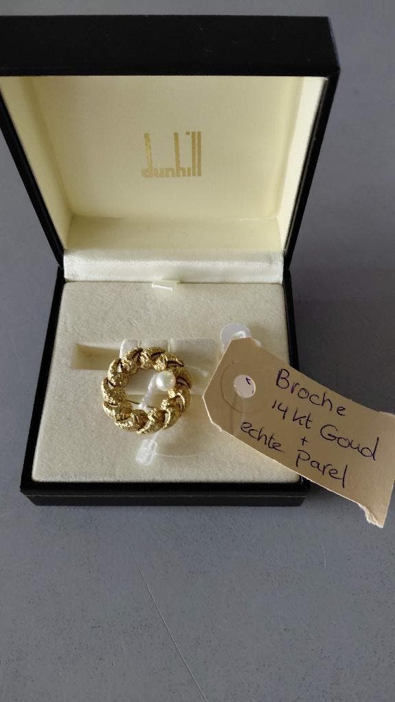 Prachtige gouden broche -14 karaat- met echte parel. De opbrengst gaat naar het werk van woord en daad.