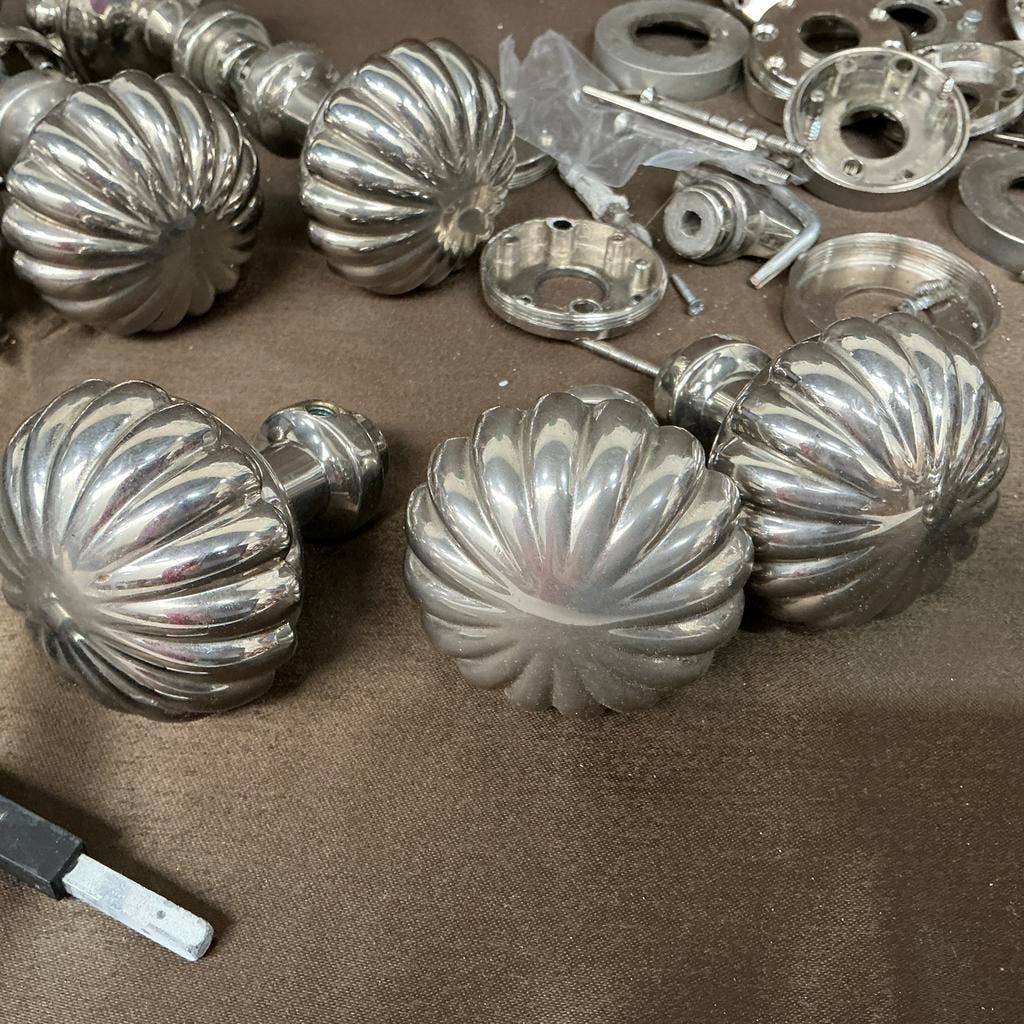 Een set van meerdere deurknoppen. Ze zijn zilverkleurig en hebben een geribbeld patroon. Er zitten ook diverse onderdelen bij om ze te monteren.