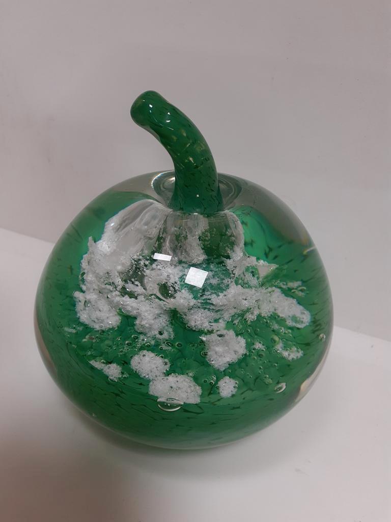Blank glazen appel, met groene kleur, naar ontwerp van cor schellen, voor glasblazerij leerdam. Conditie: helder en gaaf gesigneer