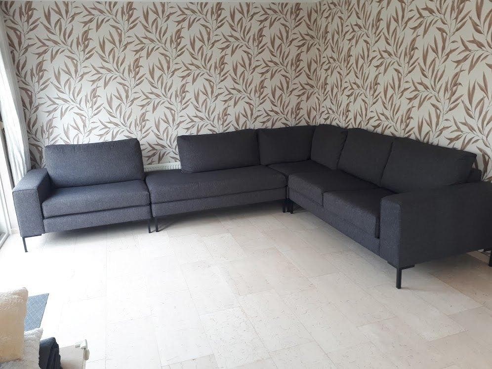 Heel mooie moderne hoekbank. Er zijn verschillende combinaties mogelijk met aan ene zijde een open of een gesloten zitstuk. Lange zijde is 275 cm korte zijde met gesloten deel 220 cm korte zijde open