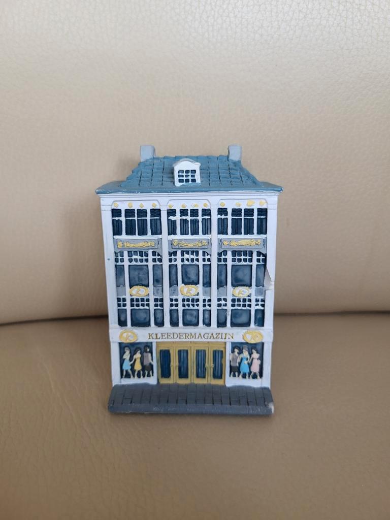 Leuk miniatuur grachten huisje, voorstellende een ‘kledingmagazijn’. Uitgave tgv blokker 100 jaar het huisje is gedetaille