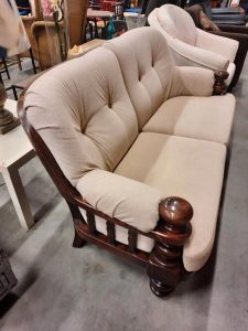 Ruime 2 zitsbank eikenhout met beige stoffen bekleding