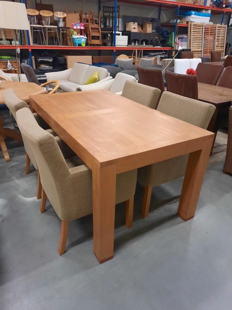 Eettafel 90×160 cm. Tafelhoogte 77 cm vrije hoogte voor stoelen (met armleuningen) 67 cm poten zijn te demonteren. Eventueel met 4