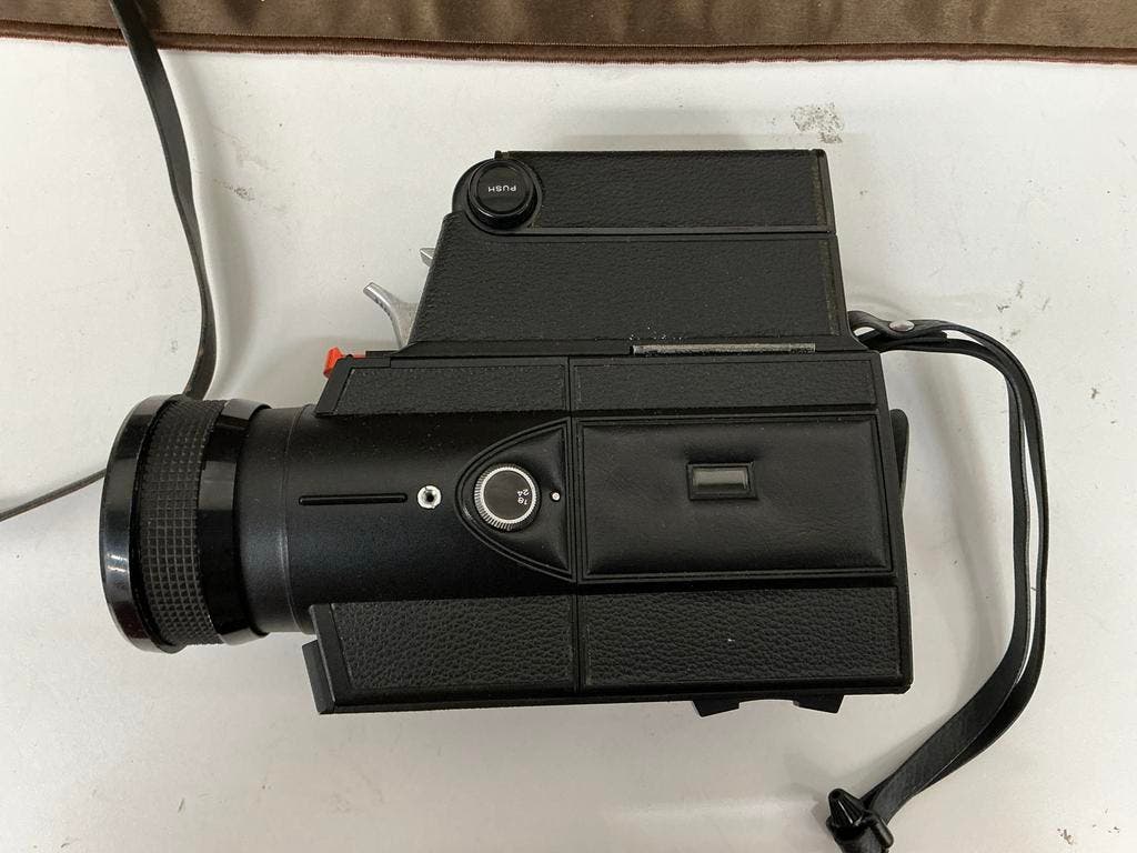 Een sankyo hi-focus cme 444 super 8 camera. De camera is zwart en heeft een draagriem. Er zit ook een handleiding bij.