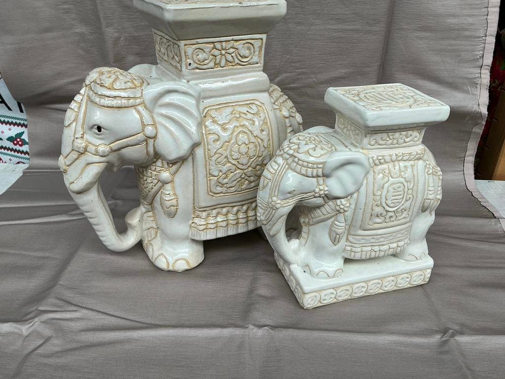 Prachtige set van twee decoratieve olifanten, gemaakt van wit keramiek met gedetailleerde versieringen. De set bestaat uit een grote en een kleinere olifant, perfect om samen of apart te plaatsen als
