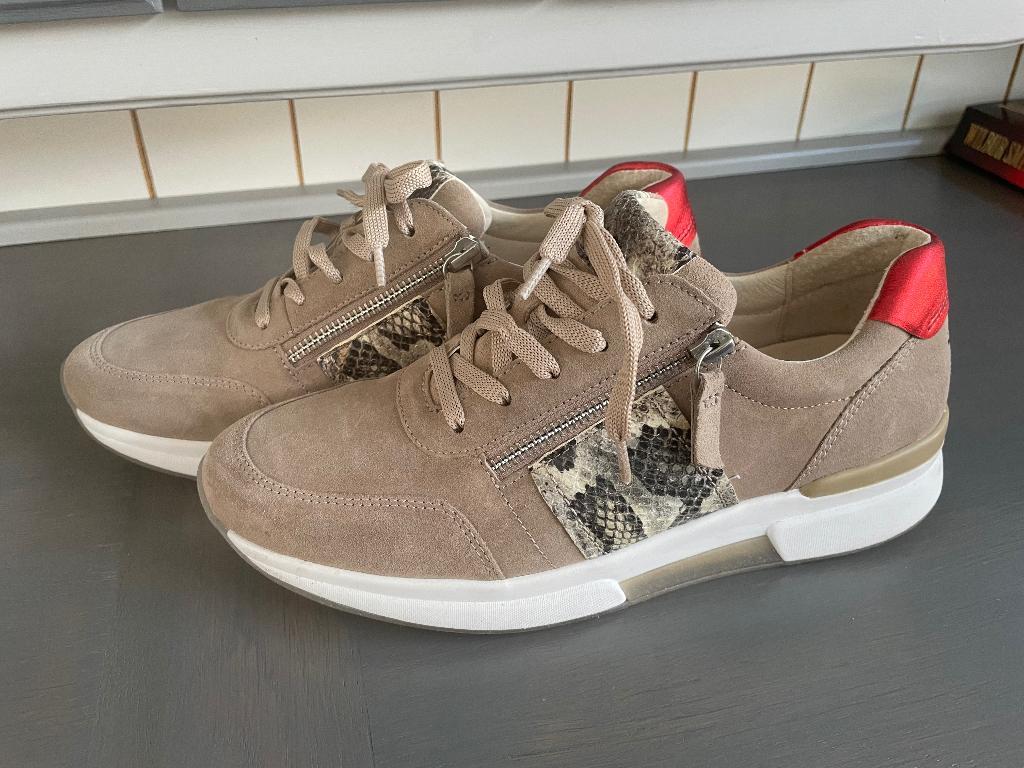 Mooie beige sneakers van gabor rolling soft. Het is maat 39. Met aan beide kanten van de schoen ritsjes, gemakkelijk aan te trekken. Het is een zogenaamde afwikkelschoen, met een hele soepele zool. On