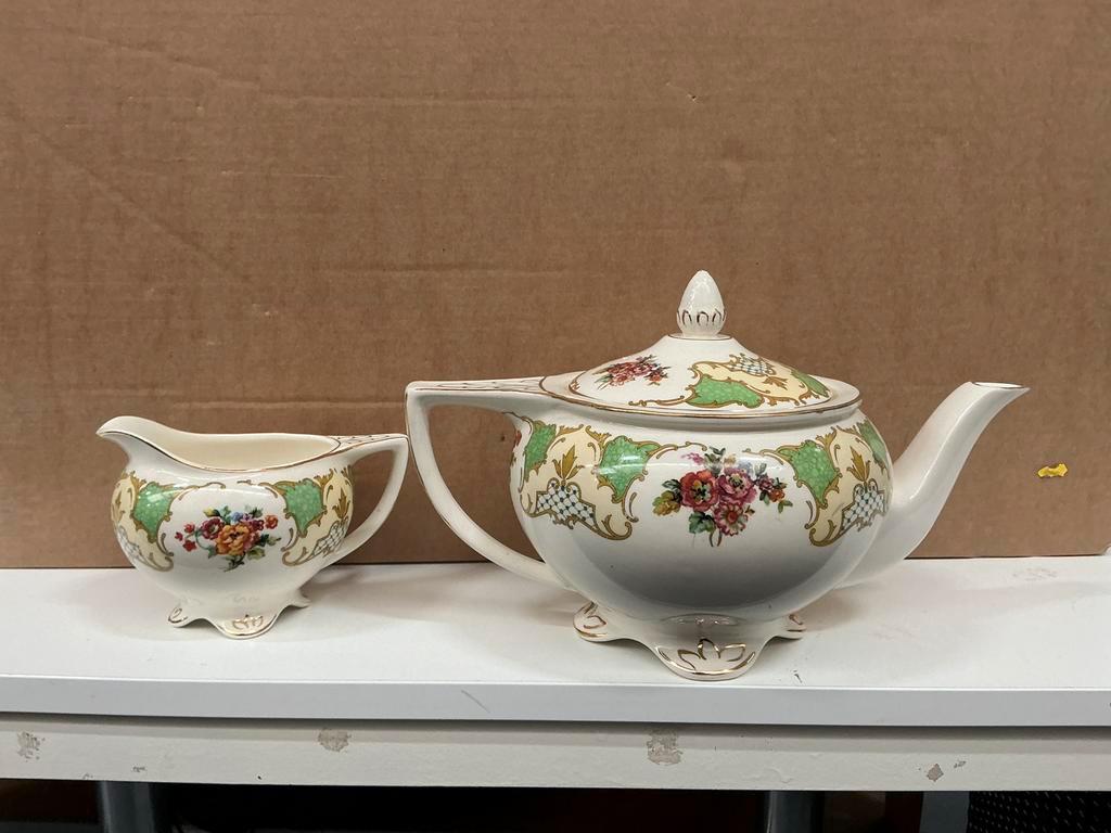 Charmante vintage theepot en melkkannetje van woods ivory ware. Dit setje is prachtig gedecoreerd met bloemmotieven en heeft een k