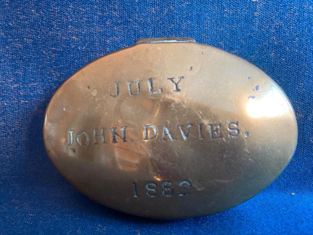 WD-023 Antieke koperen snuff doosje, Wales, 1882