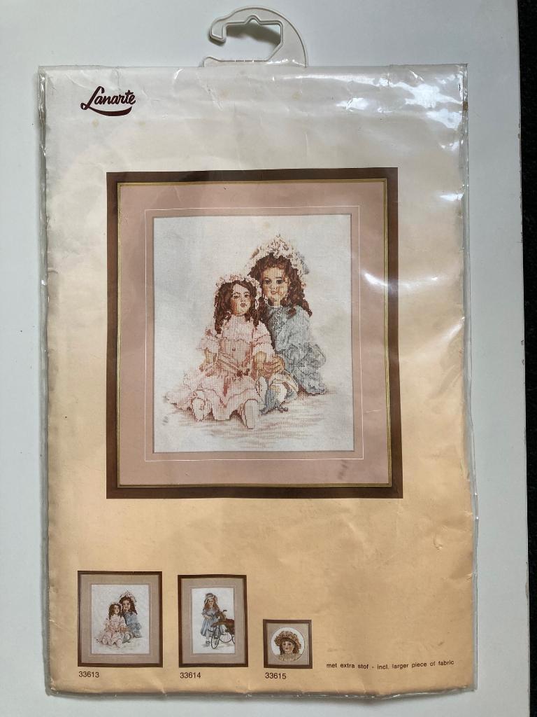 Een vintage lanarte borduurpakket afbeelding van twee victoriaanse poppen model nummer 33613 vintage pakket, nooit geopend, en com