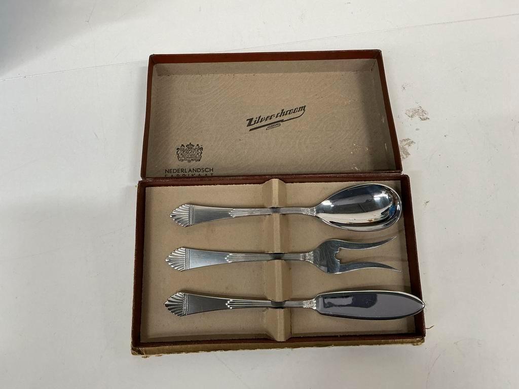 Een vintage slacouvert van het merk ‘zilverchroom’ in originele doos. Bestaande uit een slalepel en een slabvork. Nederlands fabrikaat. In goede staat.