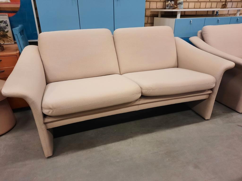 2 stuks 2 zitsbank en een stoel met beige stoffen bekleding. Losse omkeerbare zitkussens kussens rugleuning met rits bevestigd. Al
