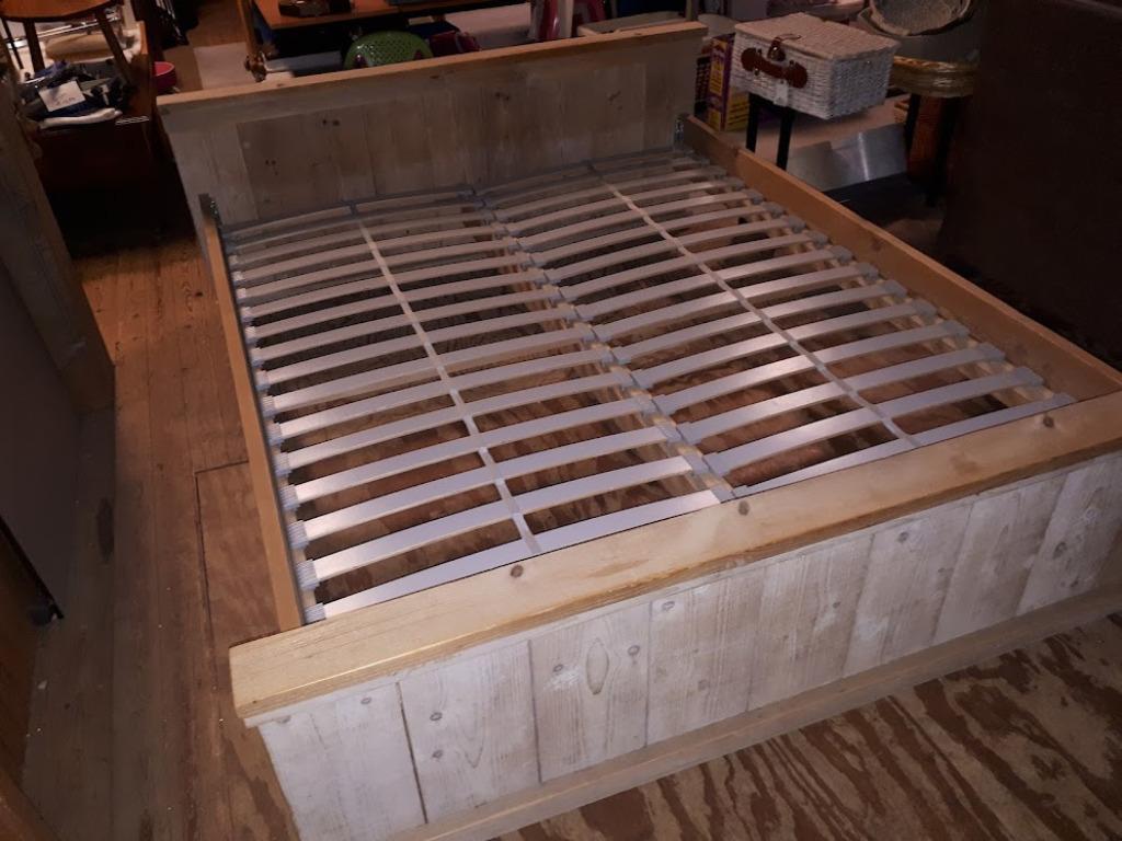 Solide bed van steigerhout 160 cm breed en 200 cm lang met lattenbodems totale bedbreedte 178 cm wordt verkocht in de kringloopwin