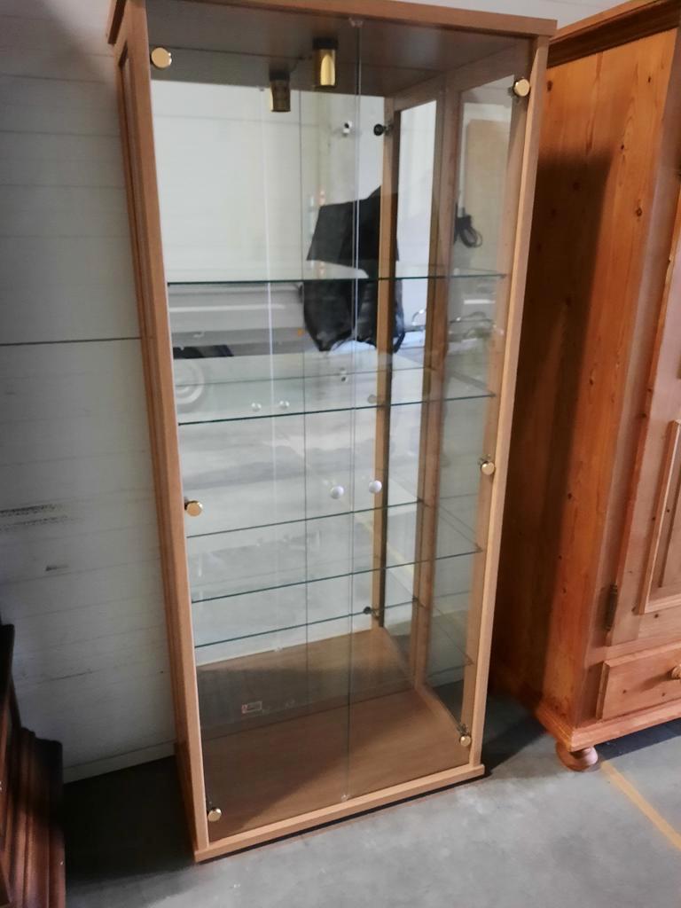 Vitrinekast rondom glas en achtwand met spiegel. 4 In hoogte verstelbare glazen schappen buiten afmetingen bxdxh=75x37x176 cm