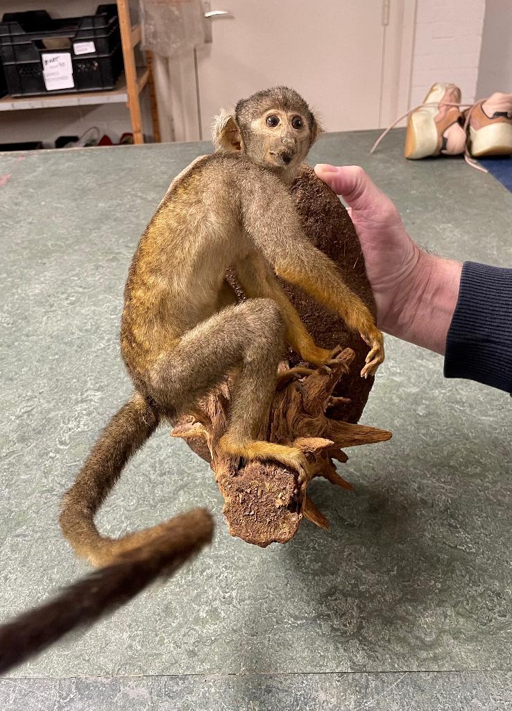 Schattig opgezet aapje op boomstam. Ongeveer 35 cm hoog. Kan aan de muur gehangen worden. Bij belangstelling graag bieden op markt