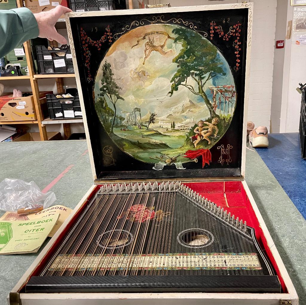 Concert tafelharp / citer van jubeltone. Helaas 1 snaar gebroken. In prachtige gedecoreerde kist. Met 2 studieboekjes en stemsleut