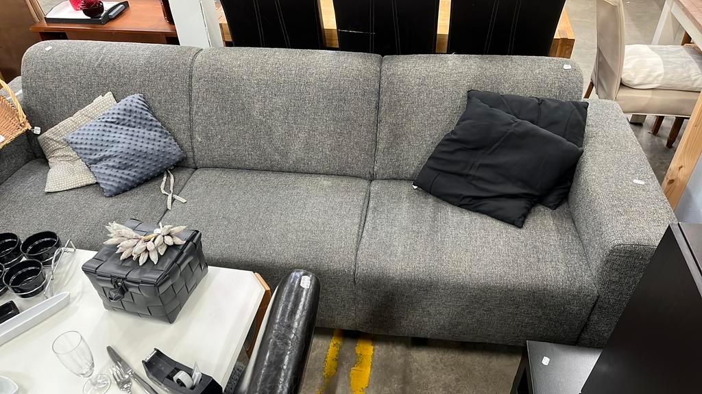 Te koop. Bank . Kleur grijs. Totale breedte bank 265 cm. Hoogte bovenkant rugleuning bank 85 cm. Totale diepte bank 90 cm. Hoogte bovenkant zitting bank 45 cm. Met gebruikerssporen