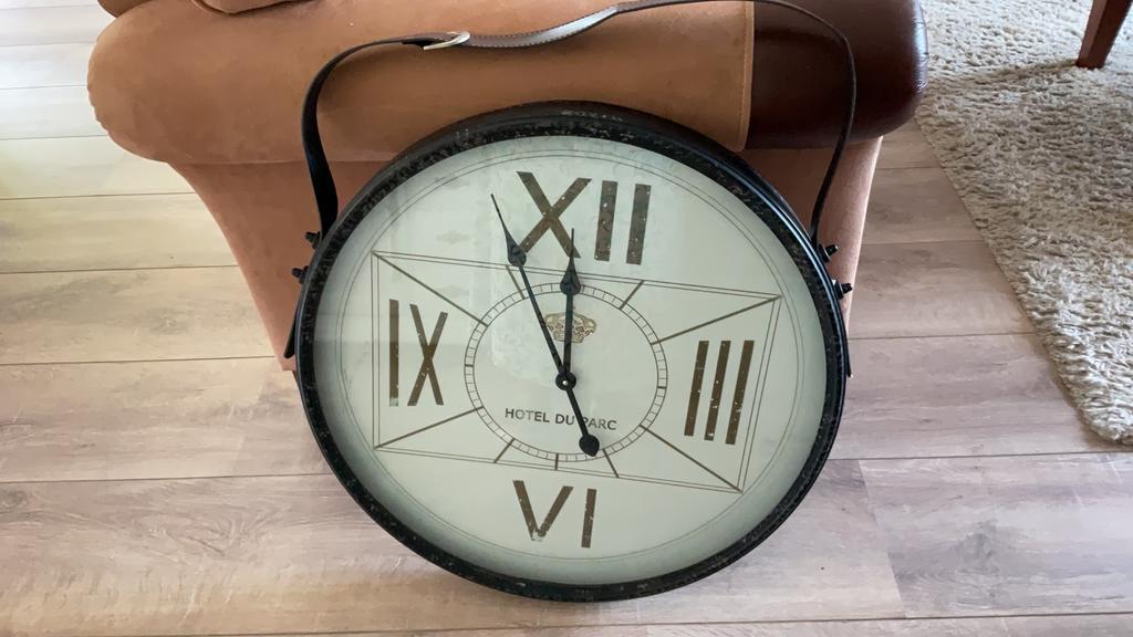 Wand klok met leren ophang hengsel op batterij doorsnee 60 cm nieuw