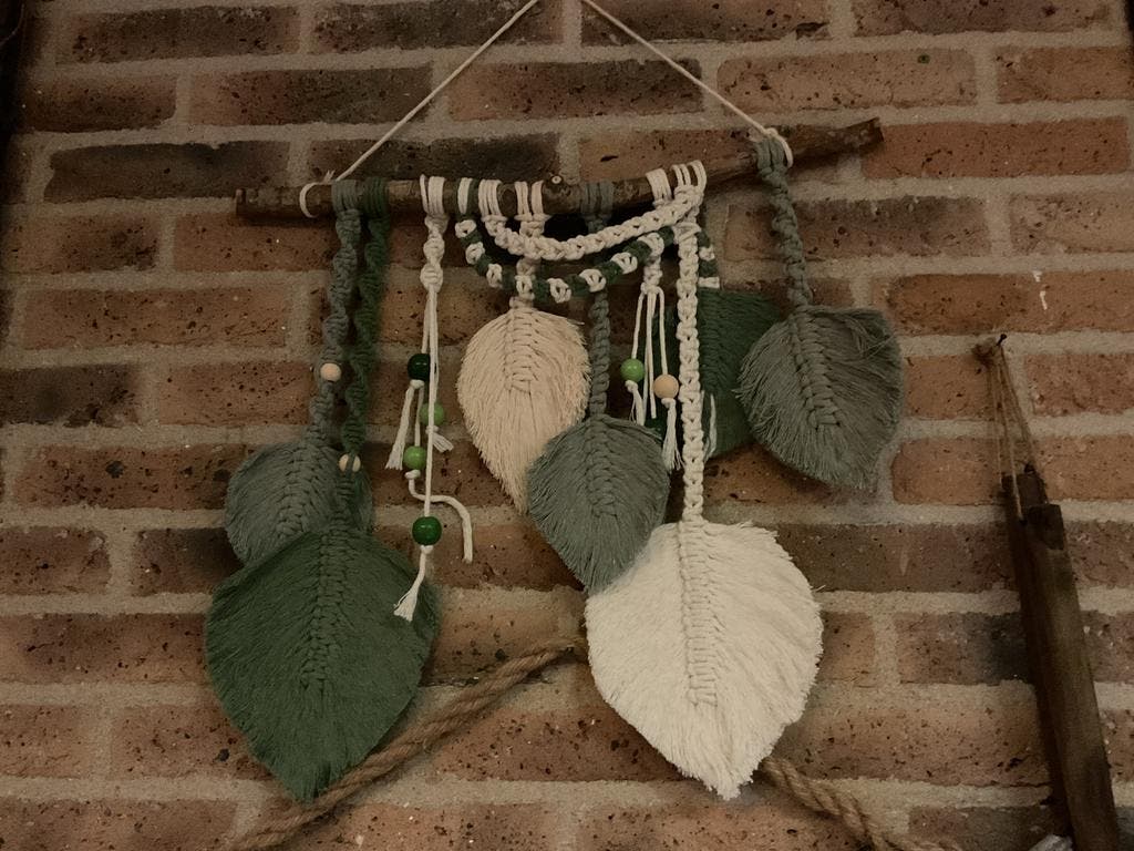 Prachtige handgemaakte macramé wandhanger, perfect om een warme en natuurlijke sfeer in huis te creëren. Deze unieke decoratie is voorzien van gedetailleerde macramé veren in verschillende groen- en c