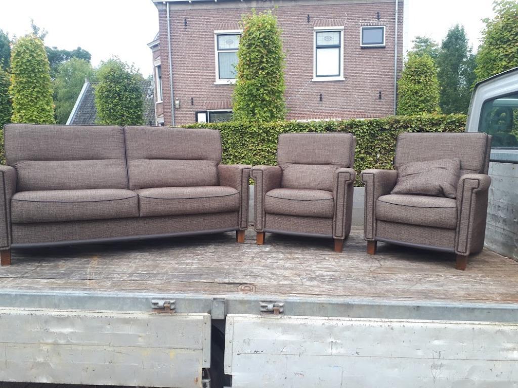 Bankstel van hoge kwaliteit in uitstekende staat. Stoffen bekleding met leren boven -en onderrand. Breedte tweezitter is 185 cm en