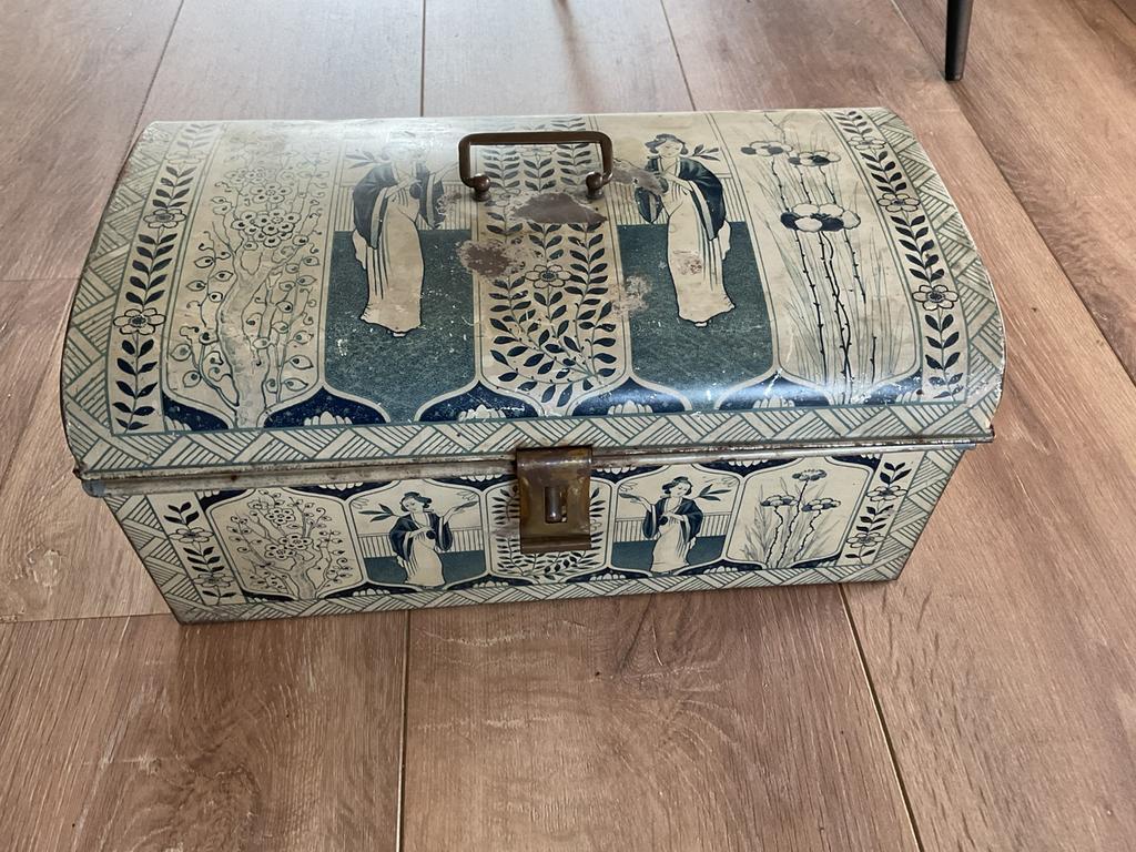 Antiek chinees metalen blik blauw grijs afbeelding vrouwen en bloemen afm 40 x 25 x 20 cm hoog