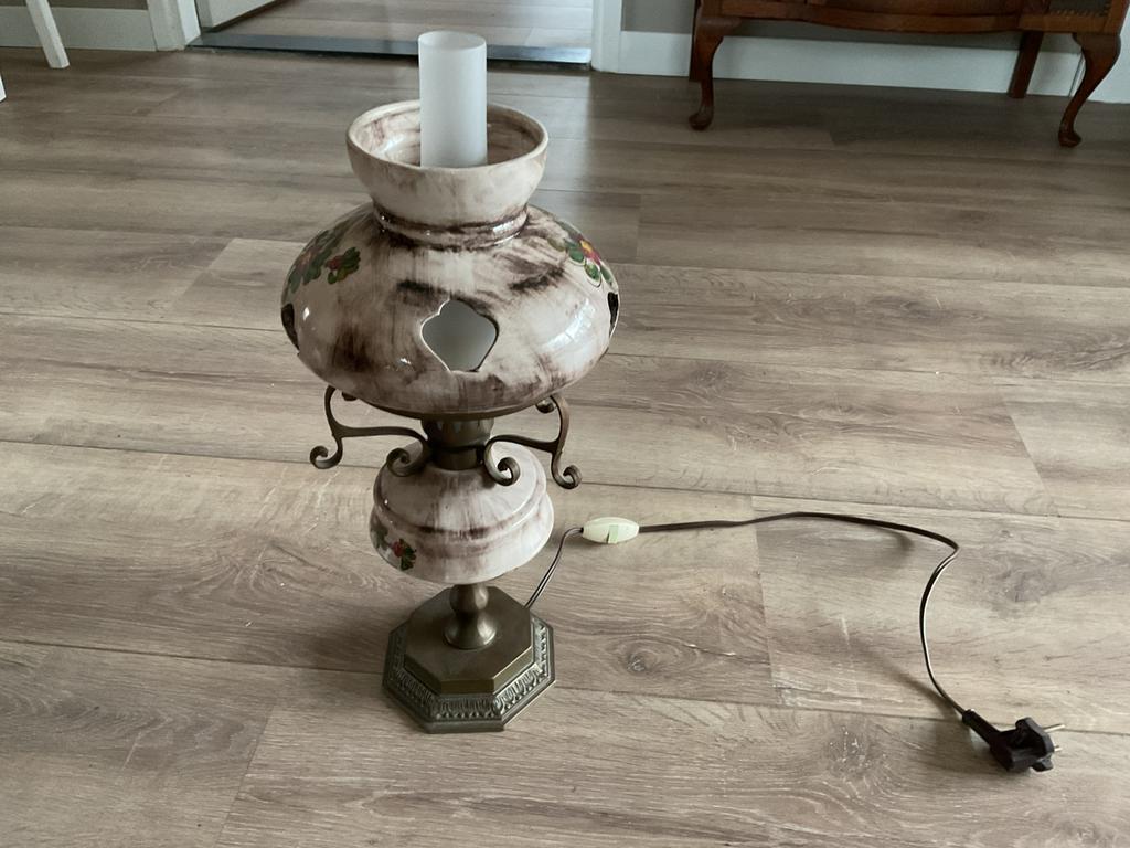 Antiek vintage olielamp met bloemen en koperen voet elektrisch gemaakt helemaal gaaf