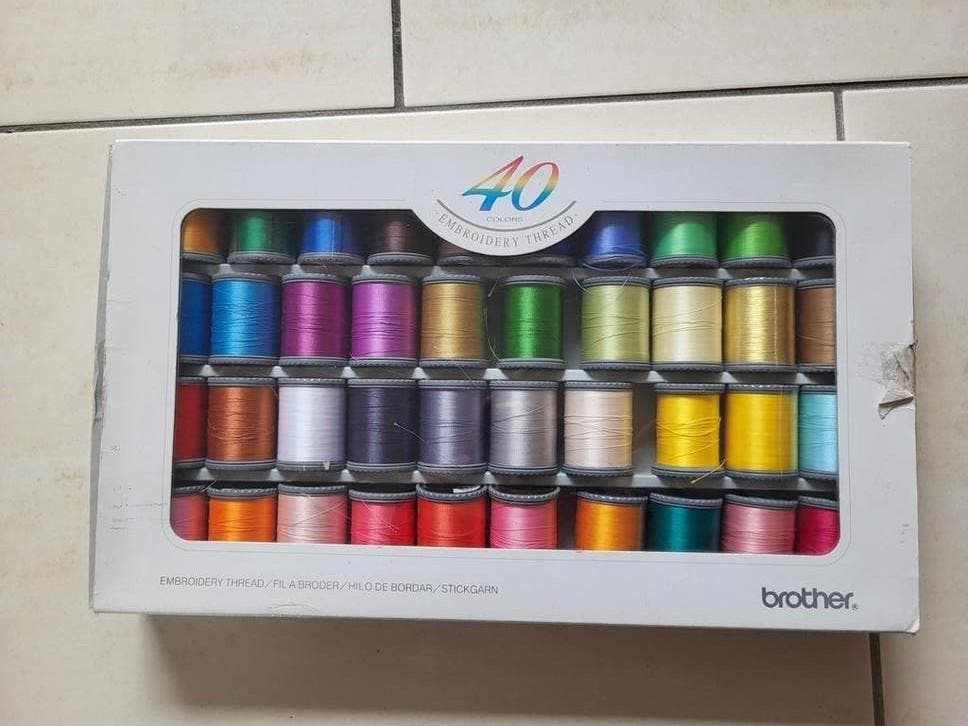 Een set van 40 klossen brother naaimachinegaren in verschillende kleuren. De set bevat een breed scala aan kleuren, zoals te zien op de foto’s. De klossen zijn netjes geordend in de originele verp