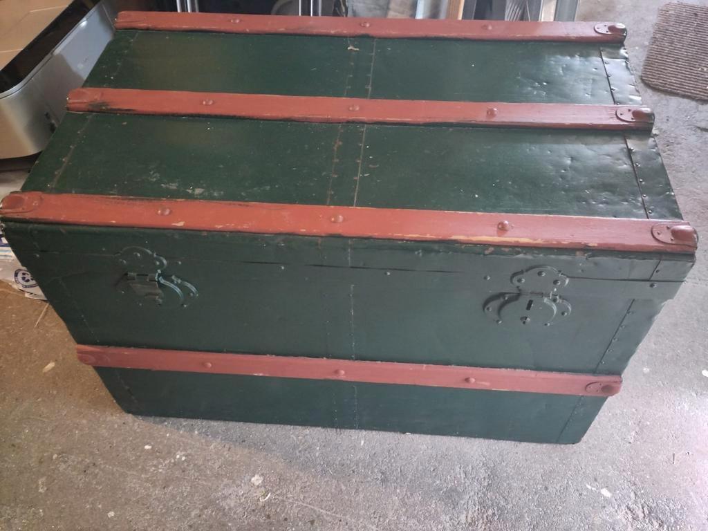 Antieke/vintage houten hutkoffer. Groen met rood. WD-18.