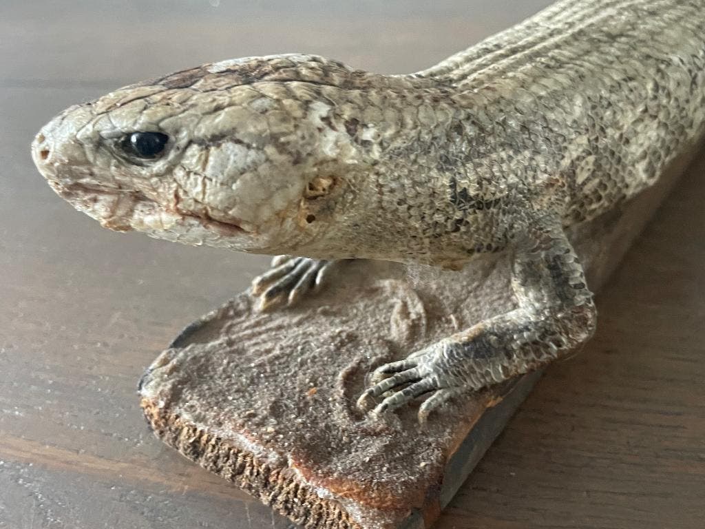 Prachtige opgezette hagedis. Het is een zogenaamde blauwtongskink. Geen papieren voorradig. Het plankje waarop hij staat is 40 cm lang. Minimumprijs is 95 euro kijk ook eens bij de andere advertenties