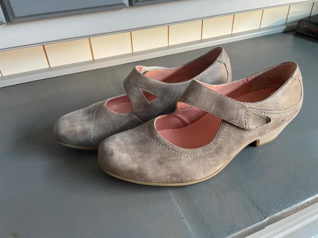 Durea instappers / bandschoenen. De kleur is beige. Het is maat 9 oftewel maat 43. Klittenbandsluiting. Wijdtemaat h, dat is iets breder dan een normale pasvorm. Deze schoenen hebben 170 euro gekost,