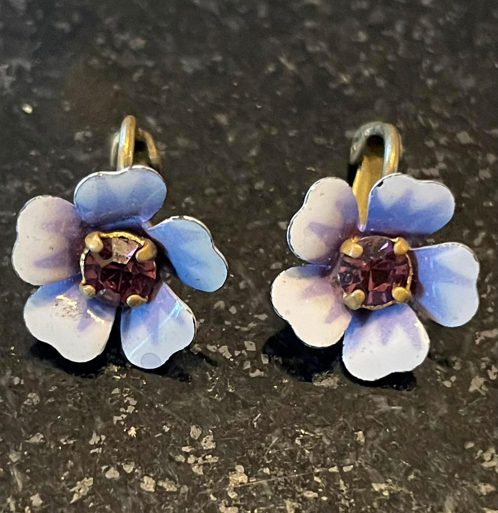 Prachtige vintage oorbellen in de vorm van bloemen met een paarse edelsteen in het midden. De oorbellen zijn in goede staat en heb