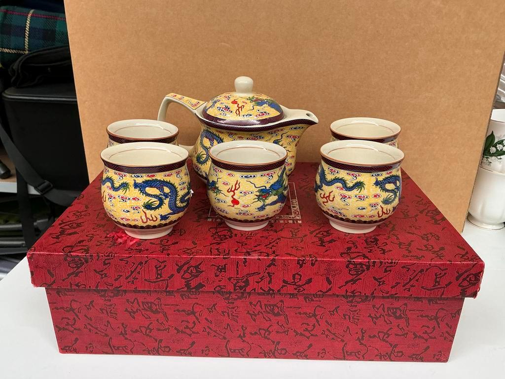 Mooi theesetje, bestaande uit een theepot en vijf kopjes. Het setje is gedecoreerd met een draken motief. Het setje is in goede st