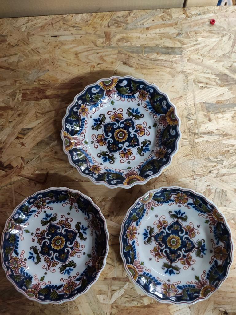 Wandborden van koninklijk tichelaar makkum. Het bovenste wandbord is iets groter dan de andere twee. Handgeschilderd. De artikelen