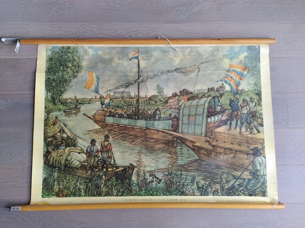Leuke vintage schoolplaat van het leidens ontzet. Afmetingen: 95,5 bij 66,5 cm. Papier, kleine beschadigingen. De artikelen die wij op marktplaats verkopen kunnen verstuurd worden of opgehaald worden