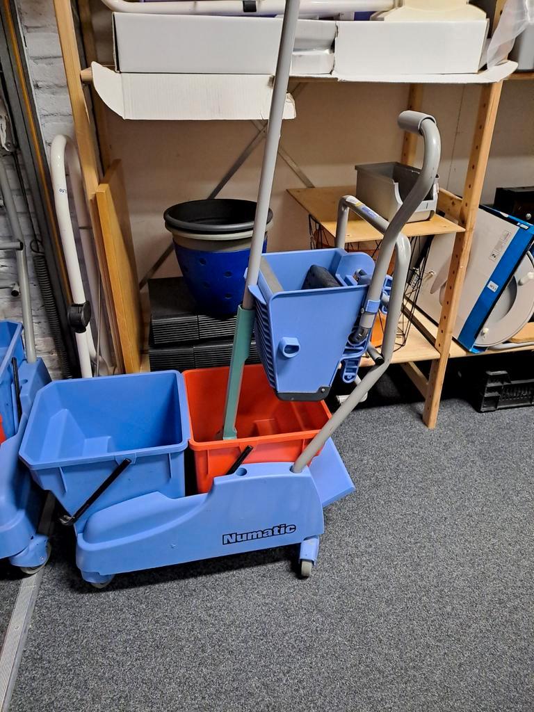 Complete dweilkar met dweilstok, ideaal voor professioneel gebruik. Stevige constructie en makkelijk te manoeuvreren. Perfect voor
