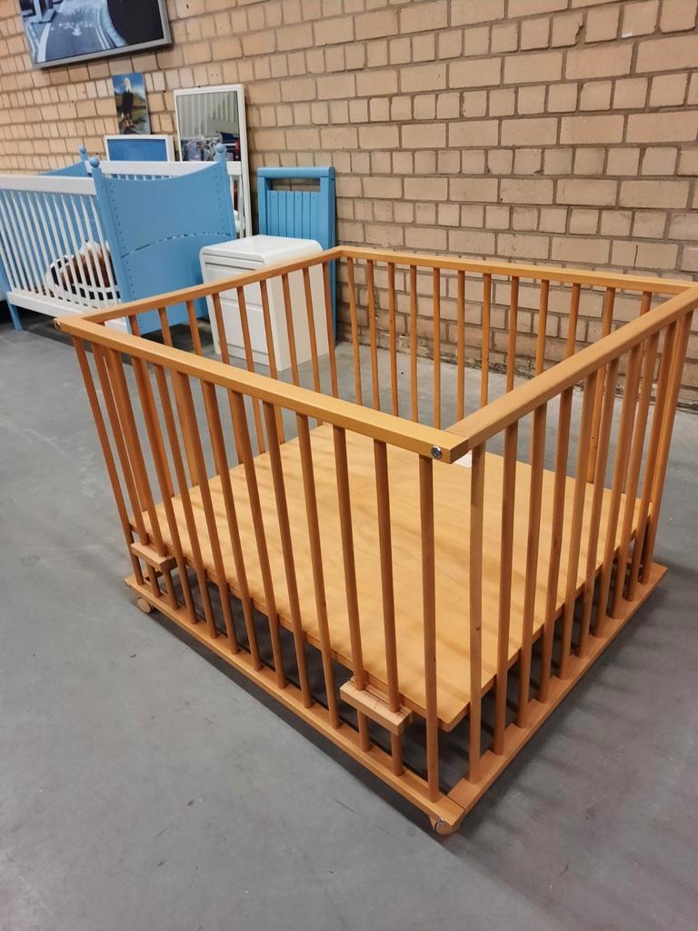 Bobita verrijdbare box 82×96 cm, max hoogte 70 cm. In hoogte verstelbare bodem. Beuken hout. Nog in nette staat.