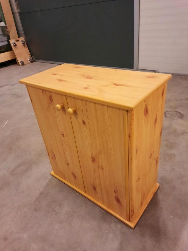 Grenen fineer kastje met 2 schappen en 2 deuren. Afm. Kastje bxdxh =:74×36×77 cm