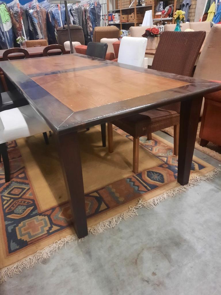 Zware eettafel 100×220 cm, bladhoogte 77 cm. Tevens een kersenhouten tafel 110×110 cm, bladhoogte 78 cm. Zie foto’s 4 t/m 6. B