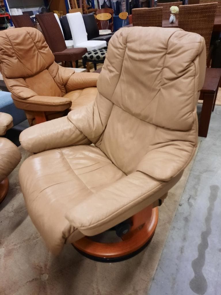 Relax draaistoel met beige leren bekleding van ekornes stressless.