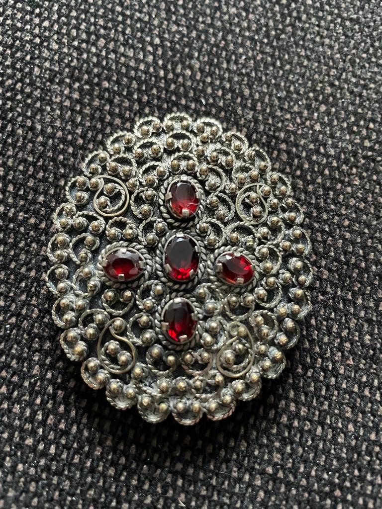 Prachtige vintage hanger, gedecoreerd met rode stenen. De hanger heeft een gedetailleerd ontwerp en is in goede staat. Een uniek sieraad om uw outfit mee op te fleuren.