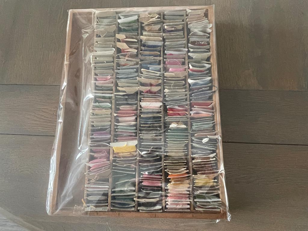 Een bak met allemaal dmc borduurgaren. Geschatte hoeveelheid 250 stuks. De hoeveelheid garen wat op een kaartje zit kan wisselen. Met de dmc nummers erop geschreven. Kijk ook eens bij de andere advert