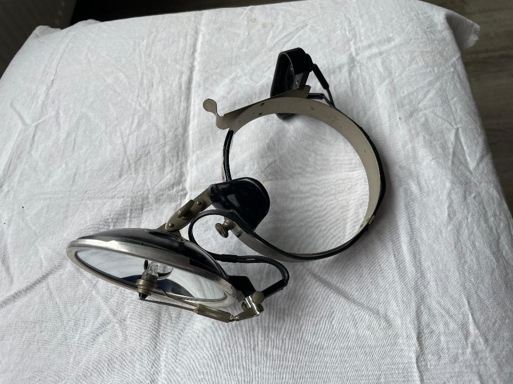 Vintage voorhoofdspiegel van een kno-arts. Werking onbekend, maar het originele lampje zit er nog in. Zie foto 3. Werkt op een batterij. Werd gebruikt rond 1960 kijk ook eens bij de andere advertentie