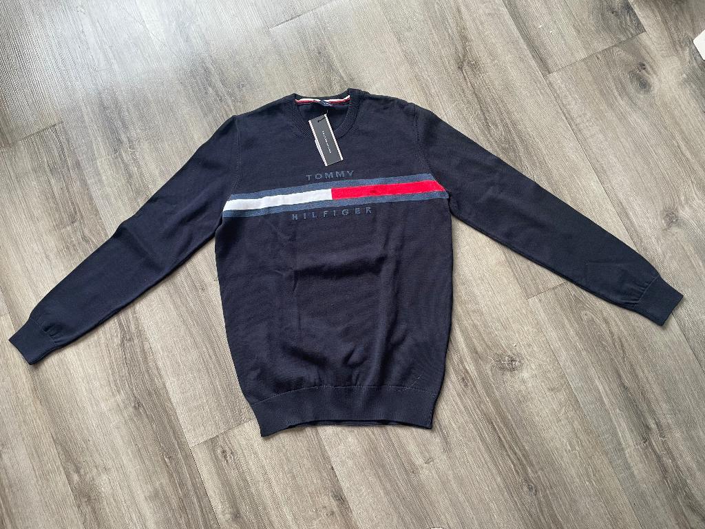 Nieuwe trui van tommy hilfiger (origineel). Het is maat s oftewel maat 164 – 170. Donkerblauw. De maat van oksel tot oksel is 51 cm en nog verder uit te rekken. De lengte vanaf de schouder tot onderaa