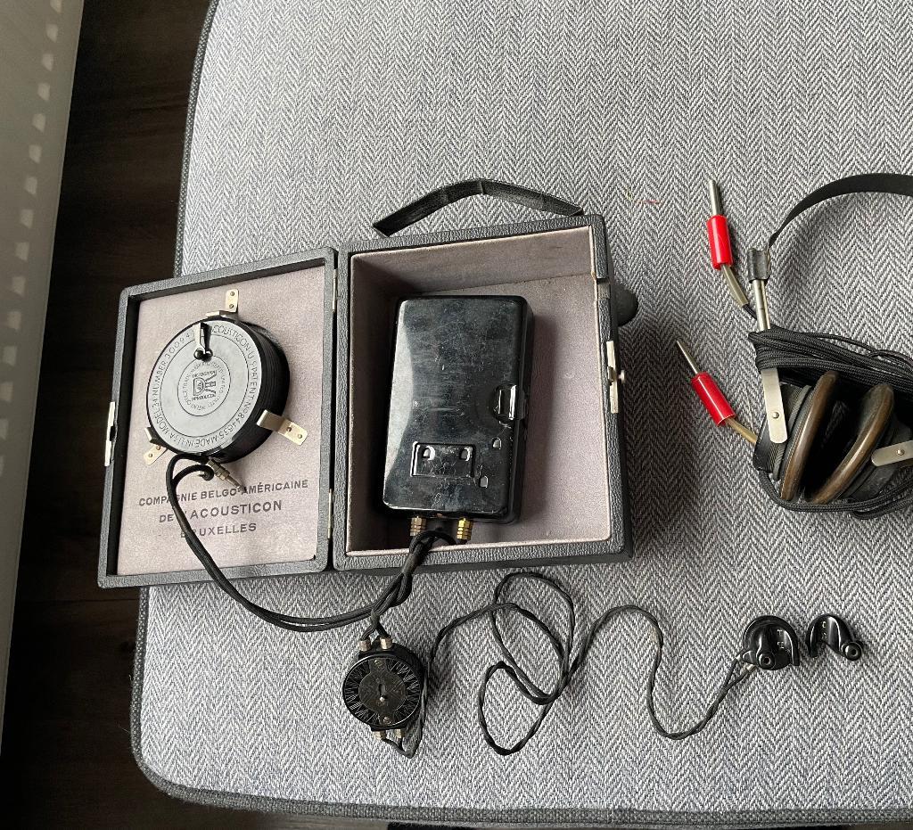 Antiek gehoorapparaat. In keurig opbergkoffertje. Dateert uit begin 1900 de koptelefoon rechts op de foto hoort er niet bij. Kijk ook eens bij de andere advertenties, daar staan nog meer antieke spull