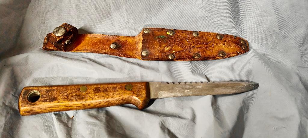 Prachtig antiek vissersmes. In leren foedraal. 25 Cm lang. Kijk ook eens bij de andere advertenties, daar staan nog meer mooie spullen de opbrengst is bestemd voor woord en daad