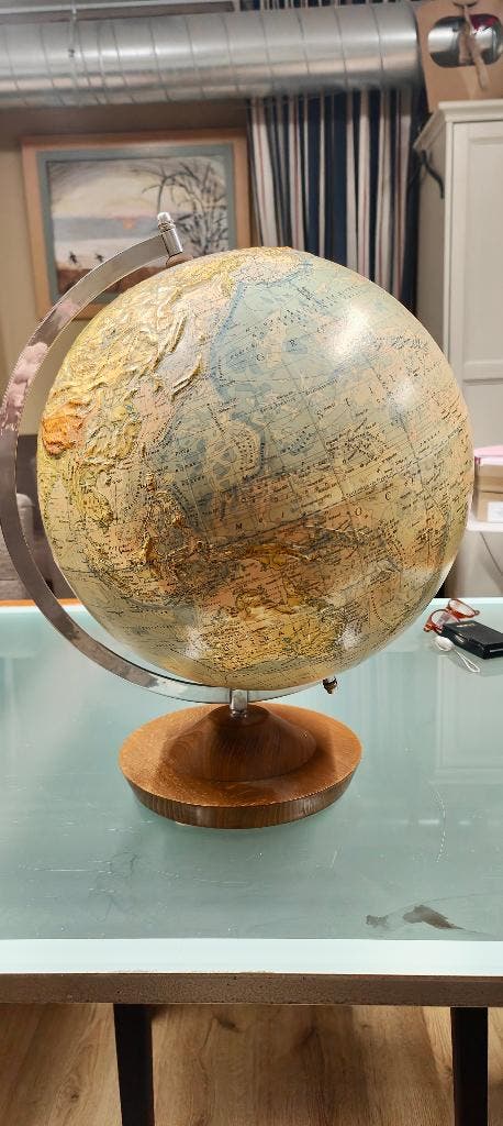 Prachtige globe van paul rath. Met relief. Midden 20ste eeuw, uitgegeven tussen 1955 en 1965 ziet er prachtig uit, op standaard. Geen verlichting mijn minimum prijs is 125 euro kijk ook eens bij de an