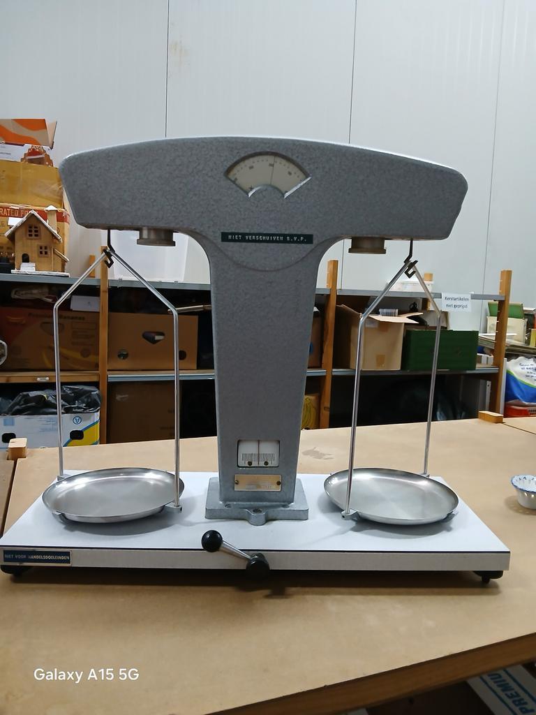 Oude drogisten weegschaal, waarschijnlijk uit de jaren ’50 of ’60. Gebruikt voor het nauwkeurig afwegen van ingrediënten in een apotheek of drogisterij. In goede staat, maar kan een schoonmaak